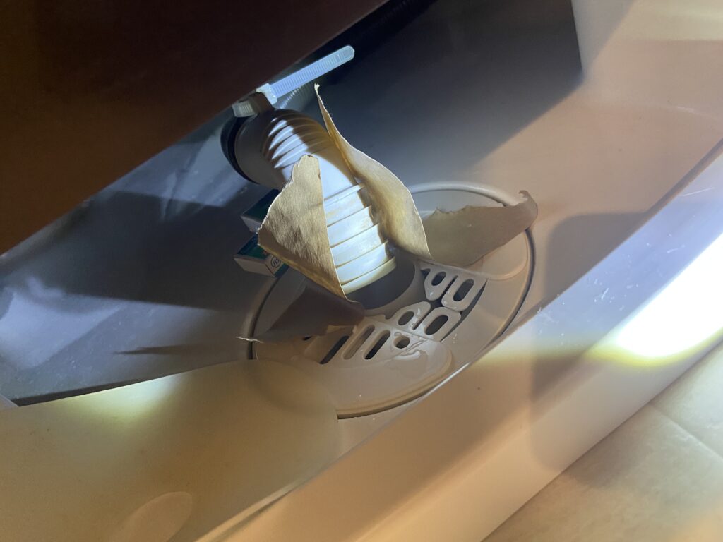 こんな感じです。少し邪魔ですが、臭いと手間には変えられません。回路は開放されているわけではないので、空気の逃げ道はないですが、途中に水のたまりができたり、粗いですがフィルターが付いたりしているので、少し空気の勢いは弱まるのかもしれません。実際に洗濯乾燥モードを行ってみても、排水トラップの水はしっかり維持されていました。大成功です。